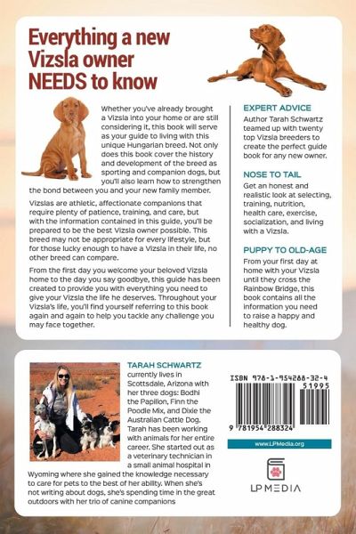 Including interviews with over 15 Top Vizsla breeders, author Tarah Schwartz has written the perfect guidebook for any new Vizsla owner! This comprehensive and easy-to-read book will prove itself invaluable as it guides you in raising a happy and healthy Vizsla from puppy to old age. Including Vizsla specific advice on topics like:Choosing the right Vizsla from a breeder (or a rescue) Supplies that will make the first few months a breeze Foundational training strategies for a Vizsla puppy Basic and advanced command training Advice for living with the quirks of the Vizsla breed Nutrition for a high-energy breed Basic grooming advice Preventative health care Vizsla specific diseases and conditions (and how to spot them) Senior Vizsla care Whether you've already brought a Vizsla into your home or are still considering it, this book will serve as your guide to living with this unique Hungarian breed. Not only does this book cover the history and development of the breed as sporting and companion dogs, but you'll also learn how to strengthen the bond between you and your new family member. Vizslas are athletic, affectionate companions that require plenty of patience, training, and care, but with the information contained in this guide, you'll be prepared to be the best Vizsla owner possible. This breed may not be appropriate for every lifestyle, but for those lucky enough to have a Vizsla in their life, no other breed can compare. This book contains everything you need to train, groom, exercise, and socialize your new Vizsla. You'll also learn basic information about nutrition and health care that will help you make the right choices for your new dog. From the first day you welcome your beloved Vizsla home, to the day you say goodbye, this guide has been created to provide you with everything you need to give your Vizsla the life he deserves. Throughout your Vizsla's life, you'll find yourself referring to this book, again and again, to help you tackle any challenge you may face together.