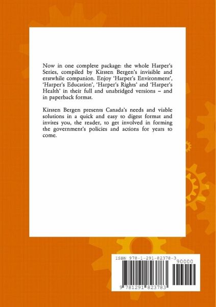 Now in one complete package: the whole Harper's Series, compiled by Kirsten Bergen's invisible and erstwhile companion. Enjoy 'Harper's Environment', 'Harper's Education', 'Harper's Rights' and 'Harper's Health' in their full and unabridged versions - and in paperback format. Kirsten Bergen presents Canada's needs and viable solutions in a quick and easy to digest format and invites you, the reader, to get involved in forming the government's policies and actions for years to come.