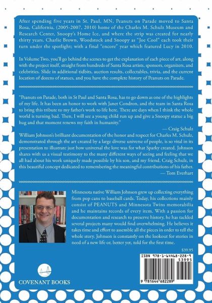 PEANUTS On Parade was the biggest tribute to PEANUTS creator, Charles Schulz, as it spanned over nine years in two states with over eight hundred statues of PEANUTS characters. Hosted by St. Paul, MN (2000-04) and Santa Rosa, CA (2005-07, '10), over five million fans from all fifty states and over sixty different countries searched for nearly eight hundred unique and individually designed five-foot statues of the Peanuts gang; each year featuring a different character. Go behind the scenes from the first discussions in the Mayor's office in 2000 to the final statues of 2010. Every step of PEANUTS on Parade is contained in these books. It all began as a modest tribute in St. Paul, MN as they wanted to honor one of their hometown heroes and was only slated to run for a single year. But the public demand was so overwhelming, it continued to run for another four years. After that, the tribute moved to Santa Rosa, California, home of the Charles Schulz Museum, where it ran for another three continuous years through 2007 plus an "encore" year in 2010. Each year wrapped up with an auction in which several statues went up for bids, each selling for thousands of dollars. The money raised paid for permanent bronze statues in both St. Paul and Santa Rosa, and began an art scholarship program in Schulz name which is still active today. Volume Two continues the Charles Schulz tribute after relocating to Santa Rosa. Charlie Brown, Woodstock, and Snoopy as Joe Cool were each highlighted in consecutive years in the city Charles Schulz called home for almost half of his life. This collection contains photos of every statue, an explanation behind each piece of art, and the history of the project itself; all straight from hundreds of artists, sponsors, organizers, and celebrities. Slide in additional research from the author, auction results, current location of dozens of statues, collectables, and trivia, and you have the complete history of Peanuts on Parade.