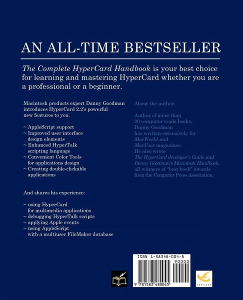 "The Complete HyperCard Handbook" is your best choice for learning and mastering HyperCard whether you are a professional or a beginner. Macintosh products expert Danny Goodman introduces HyperCard 2.2's powerful new features to you. AppleScript support; Improved user interface design elements; Enhanced HyperTalk scripting language; Convenient Color Tools for applications design; Creating double-clickable applications And shares his experience: using HyperCard for multimedia applications; debugging HyperTalk scripts; applying Apple events; using AppleScript with a multiuser FileMaker database