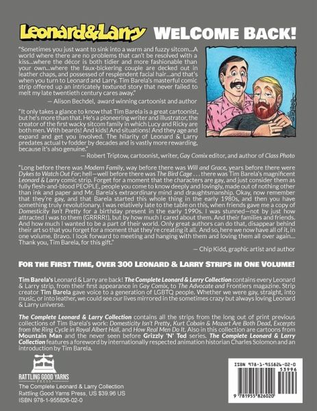 Tim Barela's Leonard & Larry are back! The Complete Leonard & Larry Collection contains every Leonard & Larry strip, from their first appearance in Gay Comix, to The Advocate and Frontiers magazine. Strip creator Tim Barela gave voice to a generation of LGBTQ people. Whether we were gay, straight, into music, or into leather, we could see our lives mirrored in the sometimes crazy but always loving Leonard & Larry universe. The Complete Leonard & Larry Collection contains all the strips from the long out-of-print previous collections of Tim Barela's work: Domesticity Isn't Pretty, Kurt Cobain & Mozart Are Both Dead, Excerpts from the Ring Cycle in Royal Albert Hall, and How Real Men Do It. Also in this collection are cartoons from Mountain Man and the never seen before Grizzly 'N' Ted series. The Complete Leonard & Larry Collection features forewords by internationally respected animation historian Charles Solomon and Gay Comix pioneer and pop culture historian, Andy Mangels, plus an introduction by Tim Barela.