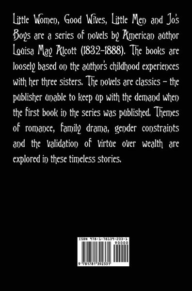 Little Women, Good Wives, Little Men and Jo's Boys are a series of novels by American author Louisa May Alcott (1832-1888). The books are loosely based on the author's childhood experiences with her three sisters. The novels are classics - the publisher unable to keep up with the demand when the first book in the series was published. Themes of romance, family drama, gender constraints and the validation of virtue over wealth are explored in these timeless stories.