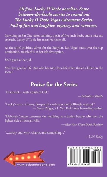 Love the bestselling Lucky O’Toole Vegas Adventure series? Get more Vegas mayhem and fun with these between-the-books stories. This set includes Lucky in Love, Lucky Bang, Lucky Now and Then, and Lucky Flash, all four Lucky O'Toole novellas in one boxset! With over 500 pages and 100+ five star reviews, you don’t want to miss this bundle full of fun, laughter, mystery and romance. Everyone Has a Hidden Talent For Lucky O’Toole it’s murder…solving it. Surviving in Sin City takes cunning, a pair of five-inch heels, and a wiseass attitude. Lucky has mastered them all and has a pair of legs she uses to kick butt and turn heads. As the Chief Problem Solver for the Babylon, Las Vegas’s most over-the-top destination, mischief is in her job description. She’s good at her job. She’s less good at life. But who has time for a life when there’s a killer on the loose? Light, funny, romantic mysteries providing a Vegas escape appropriate for anyone looking for a good laugh. AN INTERVIEW WITH DEBORAH COONTS Why did you decide to write humor? I’m not sure I decided to add snark to the Lucky, books, specifically to Lucky’s own voice, it just happened that way. When I was a kid, my mouth always got me into trouble. Finally, I’ve found a way to harness the sarcasm for the Forces of Good—or at least in a way not to anger my grandmother. And when Lucky started talking to me, she had a strong dose of sass in her. The Lucky O'Toole Vegas Adventure series is hard to categorize. Is that by design? When I set out to write Wanna Get Lucky?, I knew I wanted to write a romp through Las Vegas. I had the characters and the setting but no real understanding of narrative drive. So, I threw a young woman out of a tour helicopter into the middle of the Pirate Show and let the story unfold. A bit of murder to keep the plot moving, some wisecracking and Vegas mischief to make you laugh, and some romance to keep it interesting. A bit of a mash up, but it works. PRAISE FOR THE LUCKY O’TOOLE VEGAS ADVENTURE SERIES "Lucky’s story is funny, fast-paced, exuberant and brilliantly realized." - Susan Wiggs, #1 New York Times bestselling author "Get ready to win big--with a novel that will keep you glued to the pages all the way to the end." - Brenda Novak, New York Times & USA Today bestselling author "More fun than a winning streak in Vegas. Lucky O’Toole is a character with brains, beauty, and a wry sense of humor. Readers will want to meet her again—and soon." - Diane Mott Davidson, New York Times bestselling author "Deborah Coonts...entrusts the sleuthing to a brainy beauty who sees the lighter side of human folly." - New York Times Book Review "Las Vegas is the perfect setting for this witty tale of misdirection and larger-than-life characters. Fans of J. A. Konrath's Jack Daniels series will love this." - Library Journal, starred review "A whirlwind of a kooky crime novel, and readers will enjoy every minute of it. Coonts provides the perfect solution for readers waiting for the next Stephanie Plum book." - Booklist