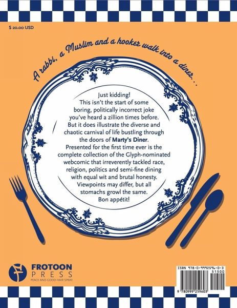 A rabbi, a Muslim and a hooker walk into a diner... Just kidding! This isn’t the start of some boring, politically incorrect joke you’ve heard a zillion times before. But it does illustrate the diverse and chaotic carnival of life bustling through the doors of Marty’s Diner. Presented for the first time ever is the complete collection of the Glyph-nominated webcomic that irreverently tackled race, religion, politics and semi-fine dining with equal wit and brutal honesty. Viewpoints may differ, but all stomachs growl the same. Bon appétit!