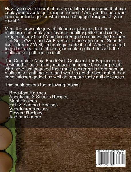 **Have you ever dreamt of having a kitchen appliance that can cook your favorite grill recipes indoors? Are you the one who has no outside grill or who loves eating grill recipes all year round? Meet the new category of kitchen appliances that can multitask and cook your favorite healthy grilled and air fryer recipes at any time! A multicooker grill combines the features of a Grill, Oven, and Air Fryer, all in one appliance. Sounds like a dream? Well, technology made it real. When you need to grill steaks, bake chicken, or cook a grilled dessert, the multicooker grill can do it all. The Complete Ninja Foodi Grill Cookbook for Beginners is designed to be a handy manual and recipe book for people who have just acquired their multi cooker grills from popular multicooker grill makers, and want to get the best out of their latest kitchen gadget as well as prepare tasty grill delicacies. This book covers the following topics:Breakfast Recipes Appetizers & Snacks Recipes Meat Recipes Fish & Seafood Recipes Vegetarian Recipes Dessert Recipes ...And much more