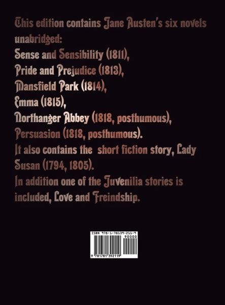 This edition contains Jane Austen's six novels unabridged: Sense and Sensibility (1811), Pride and Prejudice (1813), Mansfield Park (1814), Emma (1815), Northanger Abbey (1818, posthumous), Persuasion (1818, posthumous). It also contains the short story, Lady Susan (1794, 1805) and a story from Austen's juvenalia, Love and Friendship.