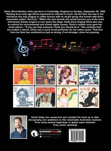 Dame Olivia Newton-John was born in Cambridge, England on Sunday, September 26, 1948. Starting at an early age Olivia expressed an interest in music. By the time she was in her mid-teens she was singing in coffee houses with an all-girl group she formed with three classmates called "Sol-Four." Within the next decade she would become one of the most well-known female singers to ever grace the stage. Aside from singing Olivia also was an activist for environmental and animal rights causes. Olivia's mother once gave her some advice-- "If you can help someone I think you should do it." She certainly took her mother's advice. Olivia was a much loved performer for her entire career. That love from her fans has continued on just as strong, if not stronger, since her passing. Daniel Selby has researched and compiled the most up to date discography ever published on this remarkable Australian musician. From early musical beginnings to global super-stardom! Truly career spanning!