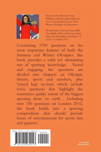 Containing 1700 questions on many aspects of both the Summer and Winter Olympics, The Complete Olympic Games Quiz Book provides a comprehensive resource that can be used in various ways, such as testing family and friends or forming the basis of a more formal quiz. The book covers the entire history of the modern Olympics, from Athens 1896 to London 2012, and includes questions on all the sports that have featured at these Games. There are also two multiple choice sections on numbers and two chapters of 'mixed bag' questions which, among other things, bring out the quirky side of the Olympics through a variety of trivia teasers. Including over 150 questions on London 2012, the book builds into a challenging but stimulating test of sporting knowledge and should provide hours of entertainment for fans of quizzes and the Olympics.