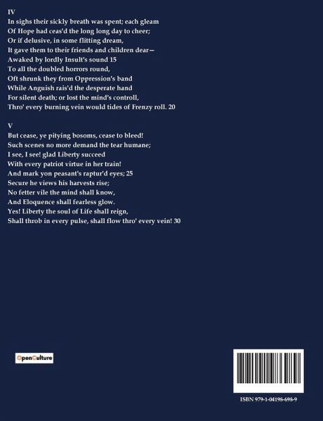 IV In sighs their sickly breath was spent; each gleam Of Hope had ceas'd the long long day to cheer; Or if delusive, in some flitting dream, It gave them to their friends and children dear¿ Awaked by lordly Insult's sound 15 To all the doubled horrors round, Oft shrunk they from Oppression's band While Anguish rais'd the desperate hand For silent death; or lost the mind's controll, Thro' every burning vein would tides of Frenzy roll. 20 V But cease, ye pitying bosoms, cease to bleed! Such scenes no more demand the tear humane; I see, I see! glad Liberty succeed With every patriot virtue in her train! And mark yon peasant's raptur'd eyes; 25 Secure he views his harvests rise; No fetter vile the mind shall know, And Eloquence shall fearless glow. Yes! Liberty the soul of Life shall reign, Shall throb in every pulse, shall flow thro' every vein! 30