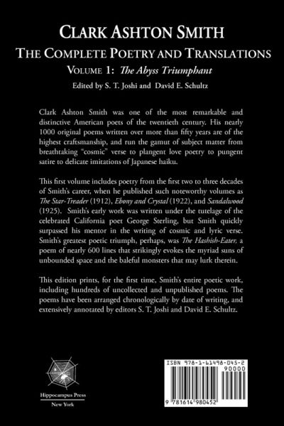 Clark Ashton Smith was one of the most remarkable and distinctive American poets of the twentieth century. His tremendous output of poetry, totaling nearly 1000 original poems written over a span of more than fifty years, is of the highest craftsmanship and runs the gamut of subject matter from breathtaking "cosmic" verse about the stars and galaxies to plangent love poetry to pungent satire to delicate imitations of Japanese haiku. This edition prints, for the first time, Smith's entire poetic work, including hundreds of uncollected and unpublished poems. The poems have been arranged chronologically by date of writing, so far as can be ascertained. This first volume includes poetry from the first two to three decades of Smith's career, when he published such noteworthy volumes as The Star-Treader (1912), Ebony and Crystal (1922), and Sandalwood (1925). Smith's early work was written under the tutelage of the celebrated California poet George Sterling, but Smith quickly surpassed his mentor in the writing of cosmic and lyric verse. Smith's greatest poetic triumph, perhaps, was The Hashish-Eater, a poem of nearly 600 lines that strikingly evokes the myriad suns of unbounded space and the baleful monsters that may lurk therein. But Smith could also write such touching elegies as "Requiescat in Pace," a dirge for a woman whose death affected him deeply. All poems have been textually corrected by consultation with manuscripts and early appearances, and have been extensively annotated by editors S. T. Joshi and David E. Schultz.