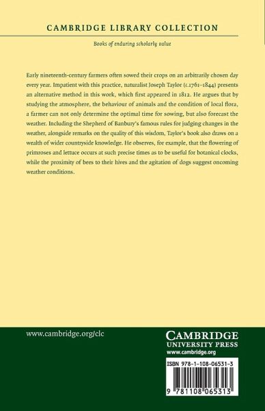 Early nineteenth-century farmers often sowed their crops on an arbitrarily chosen day every year. Impatient with this practice, naturalist Joseph Taylor (c.1761-1844) presents an alternative method in this work, which first appeared in 1812. He argues that by studying the atmosphere, the behaviour of animals and the condition of local flora, a farmer can not only determine the optimal time for sowing, but also forecast the weather. Including the Shepherd of Banbury's famous rules for judging changes in the weather, alongside remarks on the quality of this wisdom, Taylor's book also draws on a wealth of wider countryside knowledge. He observes, for example, that the flowering of primroses and lettuce occurs at such precise times as to be useful for botanical clocks, while the proximity of bees to their hives and the agitation of dogs suggest oncoming weather conditions.