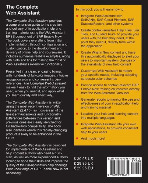 The Complete Web Assistant provides a complete guide to the creation and delivery of in-application help and training content using the Web Assistant component of SAP Enable Now. The book covers everything from initial implementation, through configuration and customization, to the development and delivery of help content and courseware. It includes numerous real-life examples, along with hints and tips for making the most of Web Assistant's extensive functionality. Presented in a clean, visual format with hundreds of full-color images, intuitive navigation aids, and convenient cross-references, The Complete Web Assistant makes it easy to find the information you need, when you need it, and apply what you learn quickly and effectively. The Complete Web Assistant has been written using the most recent version of Web Assistant (2.4.10), so it covers all of the latest enhancements and functionality. Differences between this version and previous ones are clearly identified, for full backwards compatibility. The Complete Web Assistant is designed for implementers and authors of Web Assistant who need a quick start, as well as more experienced authors looking to hone their skills and improve the quality of their in-application help offerings.