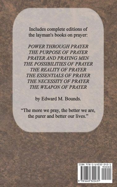 Collected here are all eight of E. M. Bounds powerful books for the layman on prayer. POWER THROUGH PRAYER THE PURPOSE OF PRAYER PRAYER AND PRAYING MEN THE POSSIBILITIES OF PRAYER THE REALITY OF PRAYER THE ESSENTIALS OF PRAYER THE NECESSITY OF PRAYER THE WEAPON OF PRAYER His books on prayer should be read again and again throughout a person's life, to help stay focused on the importance of prayer in our relationship with God. No student of thought should be without this historic book. This edition is provided in a slim volume with full text at an affordable price. "So let our lips and lives express The holy Gospel we profess."