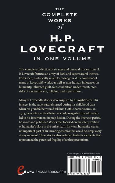 This complete collection of strange and unusual stories from H. P. Lovecraft features an array of dark and supernatural themes. Forbidden, esoterically veiled knowledge is at the forefront of many of Lovecraft's works, as well as non-human influences on humanity, inherited guilt, fate, civilization under threat, race, risks of a scientific era, religion, and superstition. Many of Lovecraft's stories were inspired by his nightmares. His interest in the supernatural started during his childhood days when his grandfather would tell him Gothic horror stories. In 1913, he wrote a critical letter to a pulp magazine that ultimately led to his involvement in pulp fiction. During the interwar period, he wrote and published stories that focused on his interpretation of humanity's place in the universe. In his view, humanity was an unimportant part of an uncaring cosmos that could be swept away at any moment. These stories also included fantastic elements that represented the perceived fragility of anthropocentrism.
