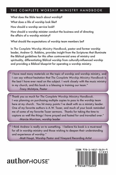 The Complete Worship Ministry Handbook by pastor and former worship leader, Andrew G. Robbins, is an extensive training resource for worship leaders, worship team members, and church members alike. Laying the foundation in the first section of the book by exploring the proper understanding and practice of true Biblical worship compared to cultural innovations, the author then turns the focus in the next two sections to worship ministry teams. Section 2 provides practical instruction to worship team members for serving God and their churches with their talents, and Section 3 provides instruction to worship leaders and ministry directors to help streamline their efforts and avoid many of the landmines associated with worship ministry leadership.