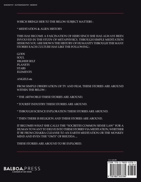 WHICH BRINGS HER TO THE BELOW SUBJECT MATTERS : * MEDITATION & ALIEN HISTORY THIS HAS BECOME A FASCINATION OF HERS SINCE SHE HAS ALWAYS BEEN INVOLVED IN THE STUDY OF METAPHYSICS. THROUGH SIMPLE MEDITATION SESSIONS YOU ARE SHOWN THE HISTORY OF HUMANITY THROUGH THE MANY STORIES EACH CULTURE HAS LIKE THE FOLLOWING : GODS SOUL HIGHER SELF PLANETS STARS ELEMENTS ANGELS etc FROM SIMPLE OBSERVATION OF TV AND FlLM, THESE STORIES ARE AROUND WITHIN THE BELOW : * THE ARTWORLD THESE STORIES ARE AROUND. * TOURIST INDUSTRY THESE STORIES ARE AROUND. * THROUGH SCIENCE EXPLORATION THESE STORIES ARE AROUND. * THEN THERE IS RELIGION AND THESE STORIES ARE AROUND. IT BECOMES WHAT SHE CALLS THE "SOCRETES COMMON SENSE LAW" FOR A HUMAN TO WANT TO DELVE INTO THESE STORIES VIA MEDITATION, WHETHER IT BE FROM CHAKRA CLEANSE TO AN EARTH MEDITATION OR THE MONKEY MIND AND EVEN THE "OM'S" OF BHUDDA ... THESE STORIES ARE AROUND TO BE EXPLORED.