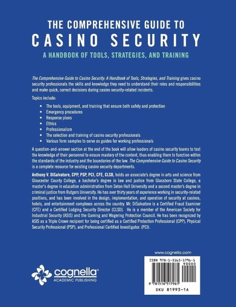 The Comprehensive Guide to Casino Security: A Handbook of Tools, Strategies, and Training gives casino security professionals the skills and knowledge they need to understand their roles and responsibilities and make quick, correct decisions during casino security-related incidents. Topics include: The tools, equipment, and training that ensure both safety and protection Emergency procedures Response plans Ethics Professionalism The selection and training of casino security professionals Various form samples to serve as guides for working professionals A question-and-answer section at the end of the book will allow leaders of casino security teams to test the knowledge of their personnel to ensure mastery of the content, thus enabling them to function within the standards of the industry and the boundaries of the law. The Comprehensive Guide to Casino Security is a complete resource for existing casino security departments. Anthony V. DiSalvatore, CPP, PSP, PCI, CFE, CLSD, holds an associate’s degree in arts and science from Gloucester County College, a bachelor’s degree in law and justice from Glassboro State College, a master's degree in education administration from Seton Hall University and a second master’s degree in criminal justice from Rutgers University. He has over thirty years of experience working in security-related positions, and has been involved in the design, implementation, and operation of security at casinos, hotels, and entertainment complexes across the country. Mr. DiSalvatore is a Certified Fraud Examiner (CFE) and a Certified Lodging Security Director (CLSD). He is a member of the American Society for Industrial Security (ASIS) and the Gaming and Wagering Protection Council. He has been recognized by ASIS as a Triple Crown recipient for being certified as a Certified Protection Professional (CPP), Physical Security Professional (PSP), and Professional Certified Investigator. (PCI).
