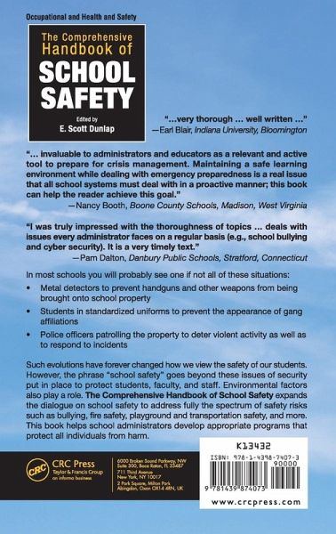 In most schools you will probably see one, if not all of the following: Metal detectors to prevent handguns and other weapons from being brought onto school property Students in standardized uniforms to prevent the appearance of gang affiliations Police officers patrolling the property to deter violent activity as well as respond to incidents Such evolutions have forever changed how we view the safety of our students. However, the phrase "school safety" goes beyond these issues of security put in place to protect students, faculty, and staff. Environmental factors also play a role. The Comprehensive Handbook of School Safety expands the dialogue on school safety to comprehensively address the spectrum of safety risks such as bullying, fire safety, playground and transportation safety, and more. Based on research and practical experience, it helps school administrators develop appropriate programs that protect all individuals from harm. Author E. Scott Dunlap brings his experience in OSHA and DOT compliance, behavior-based safety, and organizational safety culture to bear on the issue of school safety. He presents school safety from a holistic perspective and details vulnerability assessment tools and incident investigation forms to help schools develop a comprehensive safety program. By focusing on this range of issues, the book's dynamic perspective puts the keys to achieving an effective safety program within easy reach.