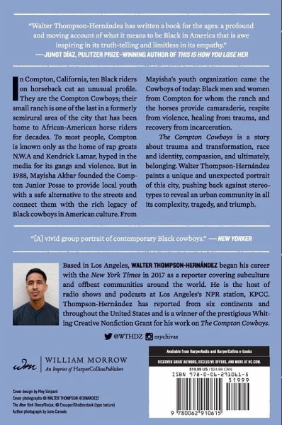 "With the raw quality of a hand-held documentary, The Compton Cowboys gallops into the origin story of this unique organization and its now-fragile legacy... With the eye of a photographer, [Thompson-Hernández] captures the minute ways a community cedes power to another. Zooming in on granular detail, he fleshes out a neighborhood in all its colors, scents and conversational rhythms... this is a rare, un-sensationalized portrait of a community fighting to reclaim its turf... In words and photographs, Thompson-Hernández reveals a three-dimensionality of people and place that can result only from time, trust and compassion." - Los Angeles Times