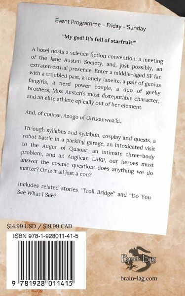 "My god! It's full of starfruit!" A hotel hosts a science fiction convention, a meeting of the Jane Austen Society, and, just possibly, an extraterrestrial presence. Enter a middle-aged SF fan with a troubled past, a lonely Janeite, a pair of genius fangirls, a nerd power couple, a duo of geeky brothers, Miss Austen's most disreputable character, and an elite athlete epically out of her element. And, of course, Azogo of Uirtkauwea'ki. Through syllabus and syllabub, cosplay and quests, a robot battle in a parking garage, an intoxicated visit to the Augur of Quaoar, an intimate three-body problem, and an Anglican LARP, our heroes must answer the cosmic question: does anything we do matter? Or is it all just a con? Includes related stories "Troll Bridge" and "Do You See What I See?"