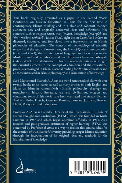 This book, originally presented as a paper to the Second World Conference on Muslim Education in 1980, for the first time in contemporary Islamic thinking and in a clear and coherent manner, elaborates new and originally conceived ideas and definitions. Key concepts such as religion (din), man (insan), knowledge (ma'rifah and `ilm), wisdom (hikmah), justice (`adl), right action (`amal and adab) are discussed, elaborated and formulated into a framework for an Islamic philosophy of education. The concept of methodology of scientific research and the study of nature along the lines of Quranic interpretation (tafsir and ta'wil), the islamization of languages and its relation to the Muslim mind and worldview, and the differences between tarbiyyah, ta'dib and ta'lim are all discussed. This is a book of definitions relating to the essential elements in the concept of education and the educational process as envisaged in Islam. Essential reading for Muslim educators and all those interested in Islamic philosophy and islamization of knowledge Syed Muhammad Naquib Al Attas is a world renowned scholar with over twenty books to his name, as well as many articles in both English and Malay on Islam in various fields - Islamic philosophy, theology and metaphysics, history, literature, art and civilization, religion and education. Some of his works have been translated into Arabic, Persian, Turkish, Urdu, French, German, Russian, Bosnian, Japanese, Korean, Hindi, Malayalam and Indonesian. Professor Al-Attas is Founder Director of the International Institute of Islamic thought and Civilization (ISTAC) which was founded in Kuala Lumpur in 1987 and which began operation officially in 1991. As a research and post graduate institution of higher learning, ISTAC was conceived by Professor al-Attas as a way to realisze this seminal ideas for the creation of true Islamic University providing proper Islamic education through the incoporation of his original ideas and methods for the Islamization of knowledge.