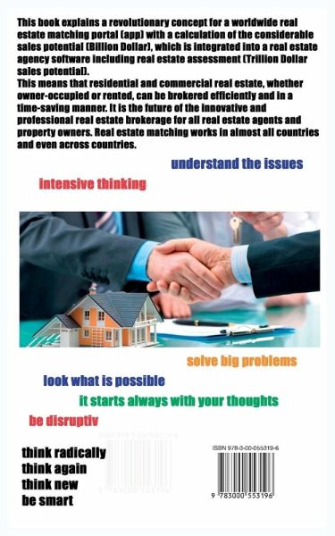 This book explains a revolutionary concept for a worldwide real estate matching portal (app) with a calculation of the considerable sales potential (Billion Dollar), which is integrated into a real estate agency software including real estate assessment (Trillion Dollar sales potential). This means that residential and commercial real estate, whether owner-occupied or rented, can be brokered efficiently and in a time-saving manner. It is the future of the innovative and professional real estate brokerage for all real estate agents and property owners. Real estate matching works in almost all countries and even across countries. Instead of "bringing" properties to the buyer or renter, with a real estate matching portal, potential buyers or renters can be qualified (search profile) and then matched and linked to the properties offered by the real estate agents.