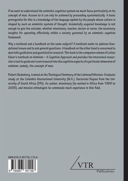 Handbook to Lothar Käser's Textbook "Animism - A Cognitive Approach". If we want to understand the animistic cognitive system we must focus particularly on its concept of man. Access to it can only be achieved by proceeding systematically. A basic prerequisite for this is a knowledge of the language spoken by the people whose culture is shaped by such an animistic system of thought. Incidentally acquired knowledge is not enough to give the outsider, whether missionary, teacher, doctor or nurse, the necessary insights for operating effectively within a society governed by an animistic cognitive framework. Why a textbook and a handbook on the same subject? A textbook seeks to address foundational issues and to ask general questions. A handbook on the other hand is concerned to deal with qualitative and quantitative research. This book is the companion volume of Lothar Käser's textbook on Animism - A Cognitive Approach and provides the interested researcher a tool to guide one's own research into the cognitive aspects of a particular dimension of animism, namely, the concept of man. Robert Badenberg, trained at the Theological Seminary of the Liebenzell Mission. Graduate study at the Columbia International University (M.A.). Doctorate Degree from the University of South Africa (DTh). As author, missionary (he worked in Africa from 1989 to 2003), and mission ethnologist he commands much experience in this field.