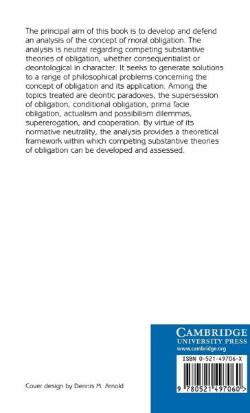 The principal aim of this book is to develop and defend an analysis of the concept of moral obligation. The analysis is neutral regarding competing substantive theories of obligation, whether consequentialist or deontological in character. It seeks to generate new solutions to a range of philosophical problems concerning the concept of obligation and its application. Among the topics treated are deontic paradoxes, the supersession of obligation, conditional obligation, prima facie obligation, actualism and possibilism, dilemmas, supererogation, and cooperation. By virtue of its normative neutrality, the analysis provides a theoretical framework within which competing substantive theories of obligation can be developed and assessed.