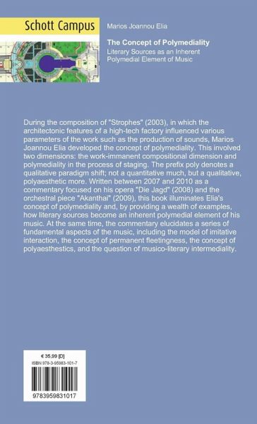 During the composition of "Strophes" (2003), in which the architectonic features of a high-tech factory influenced various parameters of the work such as the production of sounds, Marios Joannou Elia developed the concept of polymediality. This involved two dimensions: the work-immanent compositional dimension and polymediality in the process of staging. The prefix poly denotes a qualitative paradigm shift; not a quantitative much, but a qualitative, polyaesthetic more. Written between 2007 and 2010 as a commentary focused on his opera "Die Jagd" (2008) and the orchestral piece "Akanthai" (2009), this book illuminates Elia's concept of polymediality and, by providing a wealth of examples, how literary sources become an inherent polymedial element of his music. At the same time, the commentary elucidates a series of fundamental aspects of the music, including the model of imitative interaction, the concept of permanent fleetingness, the concept of polyaesthestics, and the questionof musico-literary intermediality.