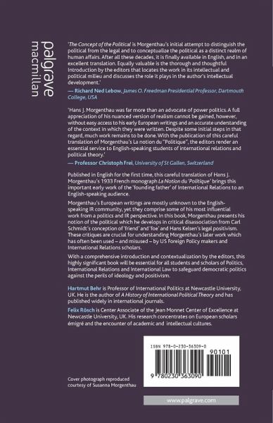 'The Concept of the Political is Morgenthau's initial attempt to distinguish the political from the legal and to conceptualize the political as a distinct realm of human affairs. After all these decades, it is finally available in English, and in an excellent translation. Equally valuable is the thorough and thoughtful Introduction by the editors that locates the work in its intellectual and political milieu and discusses the role in played in its author's intellectual development.' - Richard Ned Lebow, James O. Freedman Presidential Professor, Dartmouth College 'Hans J. Morgenthau was far more than an advocate of power politics. A full appreciation of his nuanced version of realism cannot be gained, however, without easy access to his early European writings and an accurate understanding of the context in which they were written. Despite some initial steps in that regard, much work remains to be done. With the publication of this careful translation of Morgenthau's La notion du 'Politique,' the editors render an essential service to English-speaking students of international relations and political theory.' - Professor Christoph Frei, University of St Gallen