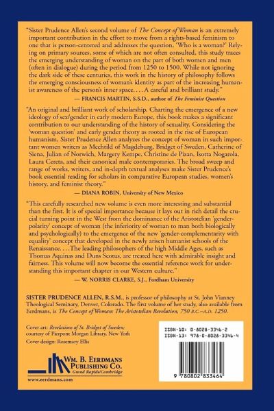This seminal work is the second volume of a widely praised study of the concept of woman in the history of Western philosophy. Sister Prudence Allen explores claims about sex and gender identity in the works of over fifty philosophers (both men and women) in the late medieval and early Renaissance periods. Touching on the thought of every philosopher who considered sex or gender identity between A.D. 1250 and 1500, The Concept of Woman provides the analytical categories necessary for situating contemporary discussion of women in relation to men. Adding to the accessibility of this fine discussion are informative illustrations, helpful summary charts, and extracts of original source material (some not previously available in English). Encyclopedic in coverage yet clearly organized and well written, The Concept of Woman will be an invaluable resource for readers interested in a wide range of disciplines.