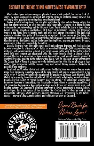 What makes tigers unique among our planet's dozens of cat species? The Concise Book of Tigers, by award-winning writer-naturalist and historian Lochlainn Seabrook, readily answers this and many other questions concerning these magnificent felines! Packed with fascinating details that are often overlooked by other natural history writers, this brief but informative work, on what the author calls "tigerology," contains 11 in-depth chapters that cover the complete ecology and life history of tigers. Topics include the basics of tiger science (vision, hearing, coloration, vocalizations, etc.); tigers in superstition, religion, and literature; where to see tigers; how to identify them; and tiger and habitat conservation. The book also contains a detailed field guide of the currently recognized 12 tiger subspecies (six living, six extinct) found across Eurasia, with each entry listing the subspecies' common and scientific names, identifying traits, distribution, habitat, feeding and hunting habits, enemies, population, life span, conservation status, and comments by the author. Densely illustrated with 150 color photos and black-and-white drawings, Col. Seabrook also includes a complete list of the world's 41 felids, an extensive bibliography (with suggested reading material), and a comprehensive index of every cat referenced in the book. Written in the author's usual lucid and compact yet educational style, this family friendly Guide to Nature's Most Remarkable Cats is a must-have for tiger lovers, tiger-watchers, and animal lovers in general. A wonderfully unique addition to the nature writing genre, with its emphasis on tiger conservancy, The Concise Book of Tigers is a treasure trove for tigriphiles and an ideal title for gift shops at tiger centers, tiger sanctuaries, wildlife reserves, zoos, and natural history museums. Available in paperback and hardcover. Acclaimed neo-Victorian scholar and outdoorsman Lochlainn Seabrook, whose literary works range from astronomy to zoology, is one of the most prolific and popular writer-historians in the world today. A Kentucky Colonel and a recipient of the prestigious Jefferson Davis Historical Gold Medal, he is currently the author and editor of 100 educationally enlightening books for all ages. Described by his readers as "game changers" and "life-altering," his voluminous writings have introduced hundreds of thousands to vital facts that have been left out of our mainstream books. A 7th generation Kentuckian of Appalachian heritage, and a former zoo keeper, ranch hand, and hunting outfitter, Col. Seabrook is a lifelong writer with a 45-year background in science, history, and religion. He is the author of the bestseller The Concise Book of Owls: A Guide to Nature's Most Mysterious Birds; as well as Rocky Mountain Equines: A Photographic Collection of Horses, Donkeys, and Mules of the American West; Rocky Mountain Bison: A Photographic Collection of Bison of the American West; and the monumental reference, North America's Amazing Mammals: An Encyclopedia for the Whole Family - the world's first scientific animal guide to include an entry on Sasquatch.