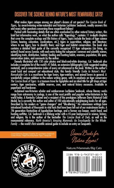 What makes tigers unique among our planet's dozens of cat species? The Concise Book of Tigers, by award-winning writer-naturalist and historian Lochlainn Seabrook, readily answers this and many other questions concerning these magnificent felines! Packed with fascinating details that are often overlooked by other natural history writers, this brief but informative work, on what the author calls "tigerology," contains 11 in-depth chapters that cover the complete ecology and life history of tigers. Topics include the basics of tiger science (vision, hearing, coloration, vocalizations, etc.); tigers in superstition, religion, and literature; where to see tigers; how to identify them; and tiger and habitat conservation. The book also contains a detailed field guide of the currently recognized 12 tiger subspecies (six living, six extinct) found across Eurasia, with each entry listing the subspecies' common and scientific names, identifying traits, distribution, habitat, feeding and hunting habits, enemies, population, life span, conservation status, and comments by the author. Densely illustrated with 150 color photos and black-and-white drawings, Col. Seabrook also includes a complete list of the world's 41 felids, an extensive bibliography (with suggested reading material), and a comprehensive index of every cat referenced in the book. Written in the author's usual lucid and compact yet educational style, this family friendly Guide to Nature's Most Remarkable Cats is a must-have for tiger lovers, tiger-watchers, and animal lovers in general. A wonderfully unique addition to the nature writing genre, with its emphasis on tiger conservancy, The Concise Book of Tigers is a treasure trove for tigriphiles and an ideal title for gift shops at tiger centers, tiger sanctuaries, wildlife reserves, zoos, and natural history museums. Available in paperback and hardcover. Acclaimed neo-Victorian scholar and outdoorsman Lochlainn Seabrook, whose literary works range from astronomy to zoology, is one of the most prolific and popular writer-historians in the world today. A Kentucky Colonel and a recipient of the prestigious Jefferson Davis Historical Gold Medal, he is currently the author and editor of 100 educationally enlightening books for all ages. Described by his readers as "game changers" and "life-altering," his voluminous writings have introduced hundreds of thousands to vital facts that have been left out of our mainstream books. A 7th generation Kentuckian of Appalachian heritage, and a former zoo keeper, ranch hand, and hunting outfitter, Col. Seabrook is a lifelong writer with a 45-year background in science, history, and religion. He is the author of the bestseller The Concise Book of Owls: A Guide to Nature's Most Mysterious Birds; as well as Rocky Mountain Equines: A Photographic Collection of Horses, Donkeys, and Mules of the American West; Rocky Mountain Bison: A Photographic Collection of Bison of the American West; and the monumental reference, North America's Amazing Mammals: An Encyclopedia for the Whole Family - the world's first scientific animal guide to include an entry on Sasquatch.