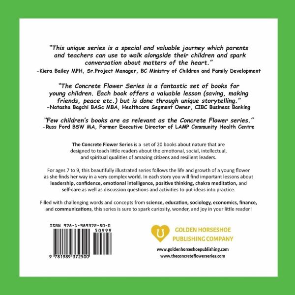 The Concrete Flower Series is a set of 20 books about nature that are designed to teach little readers about the emotional, social, intellectual, and spiritual qualities and skills of amazing citizens and resilient leaders. Join the Concrete Flower as she embarks on an unforgettable journey of self-discovery, friendship, transformation, and influence! This beautifully illustrated series follows the life and growth of a young flower as she finds her way in a very complex world. Learning from the wisdom of a Great Tree, the care of an earthworm, the spontaneity of a dandelion and a raccoon, the friendship of a young girl, and the guidance of a lotus flower, the Concrete Flower masters her unpredictable world with character and grace. In each story you will find important lessons about leadership, confidence, emotional intelligence, positive thinking, chakra meditation, and self care as well as discussion questions and activities to put ideas into practice. Filled with challenging words and concepts from science, education, sociology, economics, finance, and communications, this series is sure to spark curiosity, wonder, and joy in your little reader! Perfect for home, classroom, library, or community settings, The Concrete Flower Series is a wonderful gift whose lessons and impact are sure to last a lifetime. Start your journey TODAY! Available online in print and ebook formats.