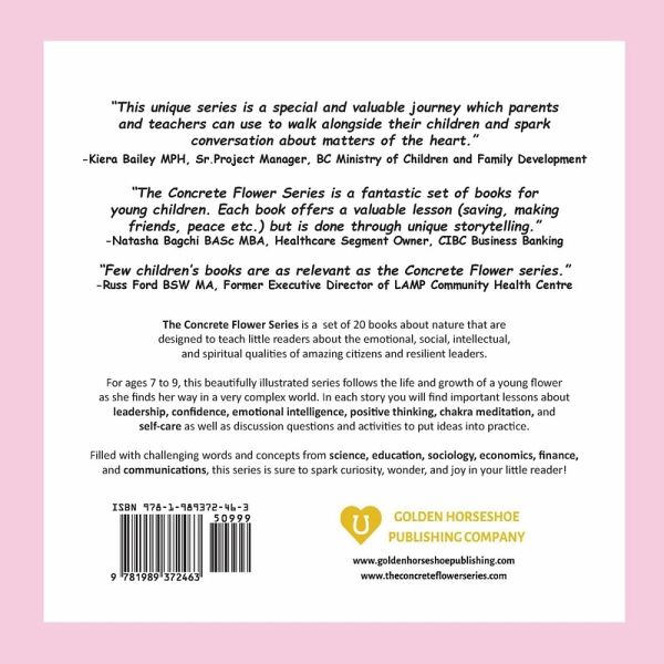 The Concrete Flower Series is a set of 20 books about nature that are designed to teach little readers about the emotional, social, intellectual, and spiritual qualities and skills of amazing citizens and resilient leaders. Join the Concrete Flower as she embarks on an unforgettable journey of self-discovery, friendship, transformation, and influence! This beautifully illustrated series follows the life and growth of a young flower as she finds her way in a very complex world. Learning from the wisdom of a Great Tree, the care of an earthworm, the spontaneity of a dandelion and a raccoon, the friendship of a young girl, and the guidance of a lotus flower, the Concrete Flower masters her unpredictable world with character and grace. In each story you will find important lessons about leadership, confidence, emotional intelligence, positive thinking, chakra meditation, and self care as well as discussion questions and activities to put ideas into practice. Filled with challenging words and concepts from science, education, sociology, economics, finance, and communications, this series is sure to spark curiosity, wonder, and joy in your little reader! Perfect for home, classroom, library, or community settings, The Concrete Flower Series is a wonderful gift whose lessons and impact are sure to last a lifetime. Start your journey TODAY! Available online in print and ebook formats.