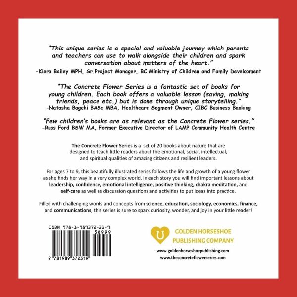 The Concrete Flower Series is a set of 20 books about nature that are designed to teach little readers about the emotional, social, intellectual, and spiritual qualities and skills of amazing citizens and resilient leaders. Join the Concrete Flower as she embarks on an unforgettable journey of self-discovery, friendship, transformation, and influence! This beautifully illustrated series follows the life and growth of a young flower as she finds her way in a very complex world. Learning from the wisdom of a Great Tree, the care of an earthworm, the spontaneity of a dandelion and a raccoon, the friendship of a young girl, and the guidance of a lotus flower, the Concrete Flower masters her unpredictable world with character and grace. In each story you will find important lessons about leadership, confidence, emotional intelligence, positive thinking, chakra meditation, and self care as well as discussion questions and activities to put ideas into practice. Filled with challenging words and concepts from science, education, sociology, economics, finance, and communications, this series is sure to spark curiosity, wonder, and joy in your little reader! Perfect for home, classroom, library, or community settings, The Concrete Flower Series is a wonderful gift whose lessons and impact are sure to last a lifetime. Start your journey TODAY! Available online in print and ebook formats.