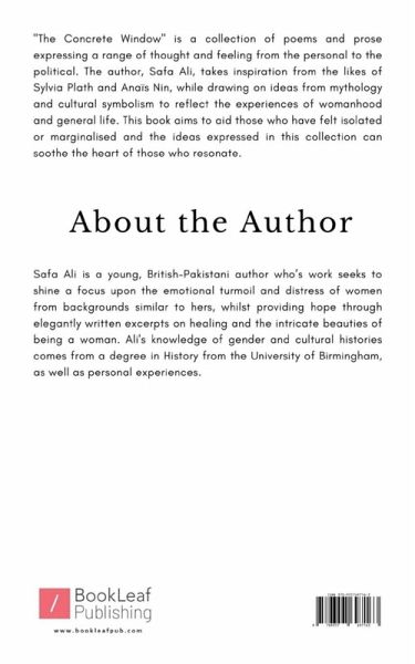 "The Concrete Window" is a collection of poems and prose expressing a range of thought and feeling from the personal to the political. The author, Safa Ali, takes inspiration from the likes of Sylvia Plath and Anaïs Nin, while drawing on ideas from mythology and cultural symbolism to reflect the experiences of womanhood and general life. This book aims to aid those who have felt isolated or marginalised and the ideas expressed in this collection can soothe the heart of those who resonate.