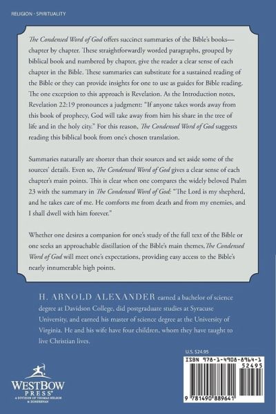 The Condensed Word of God offers succinct summaries of the Bible¿s books¿chapter by chapter. These straightforwardly worded paragraphs, grouped by biblical book and numbered by chapter, give the reader a clear sense of each chapter in the Bible. These summaries can substitute for a sustained reading of the Bible or they can provide insights for one to use as guides for Bible reading. The one exception to this approach is Revelation. As the Introduction notes, Revelation 22:19 pronounces a judgment: ¿If anyone takes words away from this book of prophecy, God will take away from him his share in the tree of life and in the holy city.¿ For this reason, The Condensed Word of God suggests reading this biblical book from one¿s chosen translation. Summaries naturally are shorter than their sources and set aside some of the sources¿ details. Even so, The Condensed Word of God gives a clear sense of each chapter¿s main points. This is clear when one compares the widely beloved Psalm 23 with the summary in The Condensed Word of God: ¿The Lord is my shepherd, and he takes care of me. He comforts me from death and from my enemies, and I shall dwell with him forever.¿ Whether one desires a companion for one¿s study of the full text of the Bible or one seeks an approachable distillation of the Bible¿s main themes, The Condensed Word of God will meet one¿s expectations, providing easy access to the Bible¿s nearly innumerable high points.