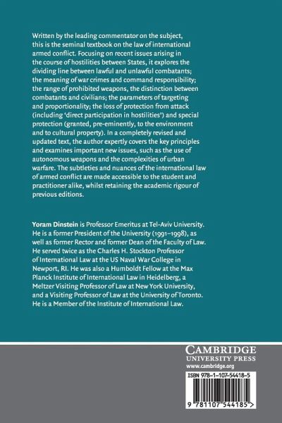 Written by the leading commentator on the subject, this is the seminal textbook on the law of international armed conflict. Focusing on recent issues arising in the course of hostilities between States, it explores the dividing line between lawful and unlawful combatants, the meaning of war crimes and command responsibility, the range of prohibited weapons, the distinction between combatants and civilians, the parameters of targeting and proportionality, the loss of protection from attack (including 'direct participation in hostilities') and special protection (granted, pre-eminently, to the environment and to cultural property). In a completely revised and updated text, the author expertly covers the key principles and includes important new issues, including the use of autonomous weapons and the complexities of urban warfare. The subtleties and nuances of the international law of armed conflict are made accessible to the student and practitioner alike, whilst retaining the academic rigour of previous editions.