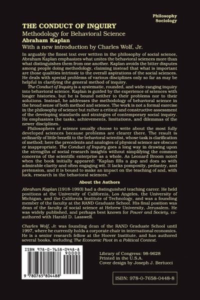 The Conduct of Inquiry is a systematic, rounded, and wide-ranging inquiry into behavioral science. Kaplan is guided by the experience of sciences with longer histories, but he is bound neither to their problems nor to their solutions. Instead, he addresses the methodology of behavioral science in the broad sense of both method and science. The work is not a formal exercise in the philosophy of science but rather a critical and constructive assessment of the developing standards and strategies of contemporary social inquiry. He emphasizes the tasks, achievements, limitations, and dilemmas of the newer disciplines.