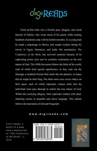 Farid ud-Din Attar was a Persian poet, druggist, and social theorist of Sufism, who wrote much of his poetry while treating hundreds of patients a day with his herbal remedies. As a young man he made a pilgrimage to Mecca, and sought wisdom during his travels in Egypt, Damascus, and India. His masterpiece, "The Conference of the Birds", has survived centuries because of its captivating poetic style and its symbolic exploration on the true nature of God. This 4500-line poem follows the birds of the world, each of which hold special significance, as they seek out the Simurgh, a mythical Persian bird much like the phoenix, in hopes that he might be their king. The birds must cross seven valleys on their quest, each of which represents various trials that the individual must pass through to realize the true nature of God. Within the overlying allegory, Attar captivates readers with short, charming stories in beautiful and clever language. This edition is printed on premium acid-free paper and follows the translation of Edward Fitzgerald.