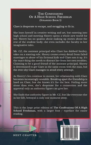 Clare is desperate to escape, and struggling to fit in. She loses herself in creative writing and art, but entering into high school and meeting Sherry opens a whole new world for her. Sherry has no qualms about making up stories about the rest of the student body; she even includes the faculty in her imaginative tales. Mr. CZ, the assistant principal who Clare has dubbed Smiley, takes on a starring role. Sherry creates every detail from failed marriages to abuse of his fictional kids and Clare eats it up. It's the exact thing she needs to distract her from her own troubles. Claiming to be a good friend of the assistant principal, Sherry is determined to get Clare in the same room with the man, but the ever-shy Clare manages to avoid every attempt. As Sherry's lies continue to mount, her relationship with Clare becomes increasingly unstable. Breaking apart the friendship is hard on Clare, but she knows it's for the best. Feeling more alone than ever, she's desperate for a connection and the approval only an authority figure can give her. She finds that authority figure in Mr. CZ, but like everyone else in her life, betrayal is only one moment away. This is the large print edition of The Confessions Of A High School Freshman, with a larger font / typeface for easier reading.