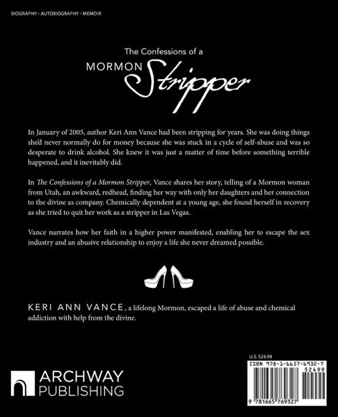 In January of 2005, author Keri Ann Vance had been stripping for years. She was doing things she'd never normally do for money because she was stuck in a cycle of self-abuse and was so desperate to drink alcohol. She knew it was just a matter of time before something terrible happened, and it inevitably did. In The Confessions of a Mormon Stripper, Vance shares her story, telling of a Mormon woman from Utah, an awkward, redhead, finding her way with only her daughters and her connection to the divine as company. Chemically dependent at a young age, she found herself in recovery as she tried to quit her work as a stripper in Las Vegas. Vance narrates how her faith in a higher power manifested, enabling her to escape the sex industry and an abusive relationship to enjoy a life she never dreamed possible.