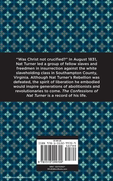 The Confessions of Nat Turner (1831) is a historical pamphlet by Nat Turner and Thomas Ruffin Gray. Published shortly after Turner's execution, The Confessions of Nat Turner is comprised of an interview with the revolutionary in the days leading up to his death, as well as independent research conducted by Gray, an attorney who represented some of the rebels involved. "And on the 12th of May, 1828, I heard a loud noise in the heavens, and the Spirit instantly appeared to me and said the Serpent was loosened, and Christ had laid down the yoke he had born for the sins of men, and that I should…mehr