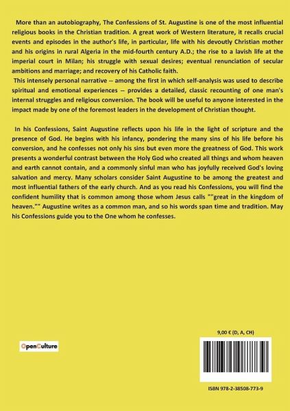 The Confessions of St. Augustine stands as one of the most influential works in Christian literature. Written as a prayer to God, this spiritual masterpiece recounts Augustine's journey from youthful ambition and sensual desire to repentance and faith. He reflects on his early years in North Africa, his rise in Roman society, and his profound conversion under the guidance of divine mercy. With philosophical depth and emotional honesty, Augustine explores sin, grace, love, and the restless human heart seeking God. His reflections continue to illuminate theology, psychology, and spirituality. The Confessions remains an enduring guide for anyone pursuing truth, self-understanding, and the transformative power of divine love.