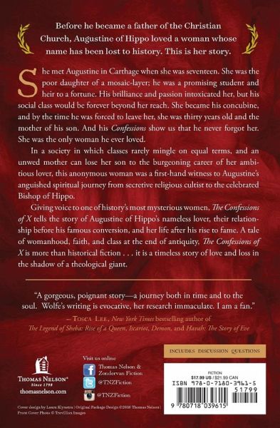 Winner of the Christianity Today 2017 Book Award! Before he became a father of the Christian Church, Augustine of Hippo loved a woman whose name has been lost to history. This is her story. She met Augustine in Carthage when she was seventeen. She was the poor daughter of a mosaic-layer; he was a promising student and heir to a fortune. His brilliance and passion intoxicated her, but his social class would be forever beyond her reach. She became his concubine, and by the time he was forced to leave her, she was thirty years old and the mother of his son. And his Confessions show us that he never forgot her. She was the only woman he ever loved. In a society in which classes rarely mingle on equal terms, and an unwed mother can lose her son to the burgeoning career of her ambitious lover, this anonymous woman was a first-hand witness to Augustine's anguished spiritual journey from secretive religious cultist to the celebrated Bishop of Hippo. Giving voice to one of history's most mysterious women, The Confessions of X tells the story of Augustine of Hippo's nameless lover, their relationship before his famous conversion, and her life after his rise to fame. A tale of womanhood, faith, and class at the end of antiquity, The Confessions of X is more than historical fiction . . . it is a timeless story of love and loss in the shadow of a theological giant.