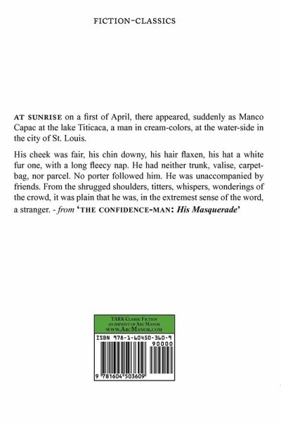 His cheek was fair, his chin downy, his hair flaxen, his hat a white fur one, with a long fleecy nap. He had neither trunk, valise, carpet-bag, nor parcel. No porter followed him. He was unaccompanied by friends. From the shrugged shoulders, titters, whispers, wonderings of the crowd, it was plain that he was, in the extremest sense of the word, a stranger. - excerpt from 'THE CONFIDENCE MAN: His Masquerade'