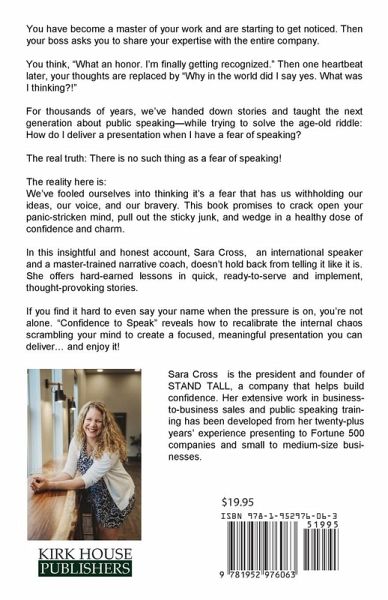 GOLD medal winner of the 31st Annual Midwest Book Awards! Non Fiction - Business You have become a master of your work and are starting to get noticed. Then your boss asks you to share your expertise with the entire company. You think, "What an honor. I'm finally getting recognized." Then one heartbeat later, your thoughts are replaced by "Why in the world did I say yes. What was I thinking?!" For thousands of years, we've handed down stories and taught the next generation about public speaking-while trying to solve the age-old riddle: How do I deliver a presentation when I have a fear of speaking? The real truth: There is no such thing as a fear of speaking! The reality here is: We've fooled ourselves into thinking it's a fear that has us withholding our ideas, our voice, and our bravery. This book promises to crack open your panic-stricken mind, pull out the sticky junk, and wedge in a healthy dose of confidence and charm. In this insightful and honest account, Sara Krisher, an international speaker, and a master-trained narrative coach doesn't hold back from telling it like it is. Instead, she offers hard-earned lessons in quick, ready-to-serve, and implement thought-provoking stories. If you find it hard even to say your name when the pressure is on, you're not alone. "Confidence to Speak" reveals how to recalibrate the internal chaos scrambling your mind to create a focused, meaningful presentation you can deliver... and enjoy it!