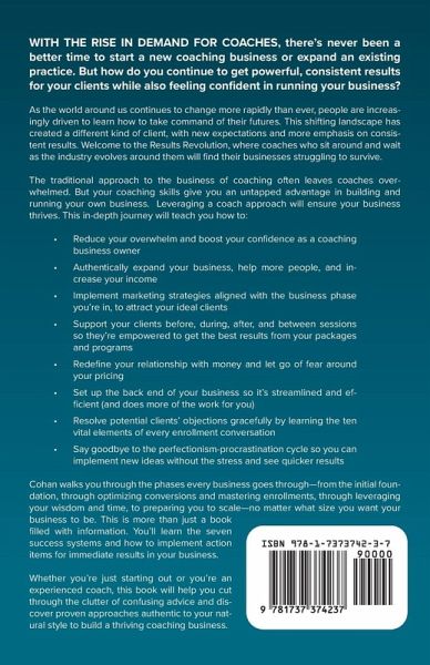 With the rise in demand for coaches, there's never been a better time to start a new coaching business or expand an existing practice. But how do you continue to get powerful, consistent results for your clients while also feeling confident in running your business? As the world around us continues to change more rapidly than ever, people are increasingly driven to learn how to take command of their futures. This shifting landscape has created a different kind of client, with new expectations and more emphasis on consistent results. Welcome to the Results Revolution, where coaches who sit around and wait as the industry evolves around them will find their businesses struggling to survive. The traditional approach to the business of coaching often leaves coaches overwhelmed. But your coaching skills give you an untapped advantage in building and running your own business. Leveraging a coach approach will ensure your business thrives. This in-depth journey will teach you how to:Reduce your overwhelm and boost your confidence as a coaching business owner Authentically expand your business, help more people, and increase your income Implement marketing strategies aligned with the business phase you're in, to attract your ideal clients Support your clients before, during, after, and between sessions so they're empowered to get the best results from your packages and programs Redefine your relationship with money and let go of fear around your pricing Set up the back end of your business so it's streamlined and efficient (and does more of the work for you) Resolve potential clients' objections gracefully by learning the ten vital elements of every enrollment conversation Say goodbye to the perfectionism-procrastination cycle so you can implement new ideas without the stress and see quicker results Cohan walks you through the phases every business goes through-from the initial foundation, through optimizing conversions and mastering enrollments, through leveraging your wisdom and time, to preparing you to scale-no matter what size you want your business to be. This is more than just a book filled with information. You'll learn the seven success systems and how to implement action items for immediate results in your business. Whether you're just starting out or you're an experienced coach, this book will help you cut through the clutter of confusing advice and discover proven approaches authentic to your natural style to build a thriving coaching business.