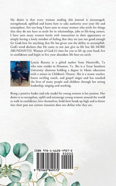My desire is that every woman reading this journal is encouraged, strengthened, uplifted and learns how to take authority over your life and atmosphere. For too long I have seen so many women who settle for things that they do not have to settle for in relationships, jobs or life-long careers. I have seen many women battle with insecurities in their appearance or simply having a lowly mindset of feeling that they are just not good enough for Gods best for anything that He has given you the ability to accomplish. God's word declares that He came to not just give us life but life MORE ABUNDANTLY. Woman of God it's time for you to lift up your head, live in confidence and begin to live your abundant life here on earth. Lyncia Recetta is a gifted author from Huntsville, Tx who now resides in Houston, Tx. She is a Texas Southern University alumnus holding a degree in Music education with a minor in Children's Theatre. She is a music teacher, baton twirling coach, and gospel singer and has touched the lives of many people and children through her strong leadership, singing and teaching. Being a positive leader and role model for young women is her passion. Her desire is to strengthen, uplift and encourage young women around the world to walk in confidence, love themselves, hold their heads up high and to know that their past nor current situation does not define who they are.